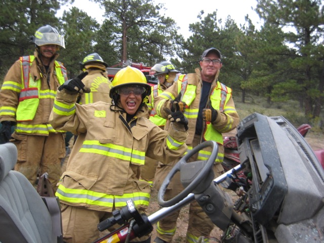In the parking lot of the beautiful Shambhala Mountain Center campus, Tony Falbo from Poudre Canyon Fire taught us some of his "jaws of life" skills as well as how to quickly and efficiently work as a team to free auto-accident victim. From stabilizing the vehicle, punching and cutting out the windows, to cutting the posts, lifting off the roof, we used a variety of hydraulically powered tools to pry the vehicle open. Over the course of a day we went through it all and took apart 4 cars in the process.
